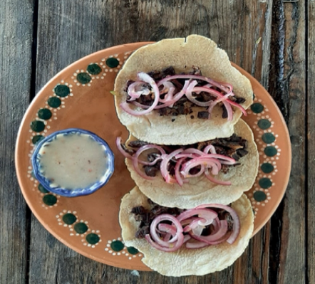 Prepare the dough with the nixtamalized white corn with water and salt to taste. Knead into tortilla shapes and cook in the Comal. Set aside and reserve.
